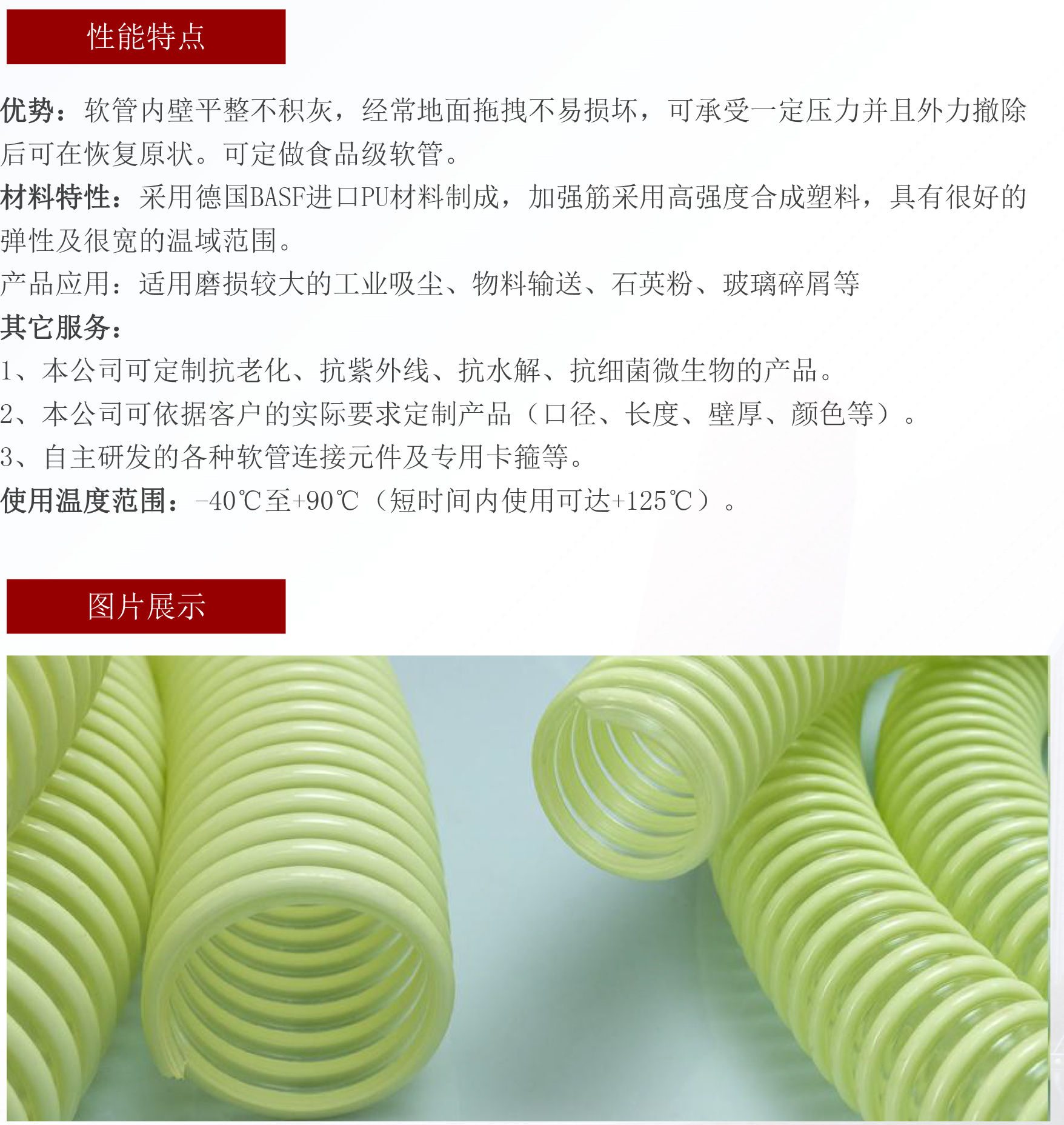 材料特性:采用德國BASF進口PU材料制成,加強筋采用高強度合成塑料,具有很好的彈性及很寬的溫域范圍。產品應用:適用磨損較大的工業吸塵、物料輸送、石英粉、玻璃碎屑等。