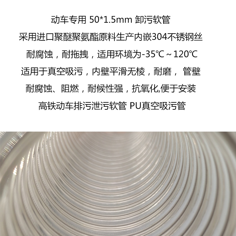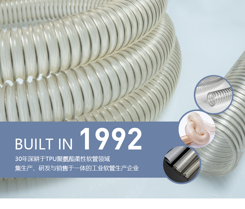 產品特點:材料特性:優質聚氨酯原料,內嵌銅鋼絲加工而成,耐磨性能優越,可達PVC軟管的5-10倍。產品應用:適用空間狹小或活動頻繁的工業除塵設備、通風設備等。如:粉塵、木屑、纖維碎屑、油蒸汽、焊煙等。
