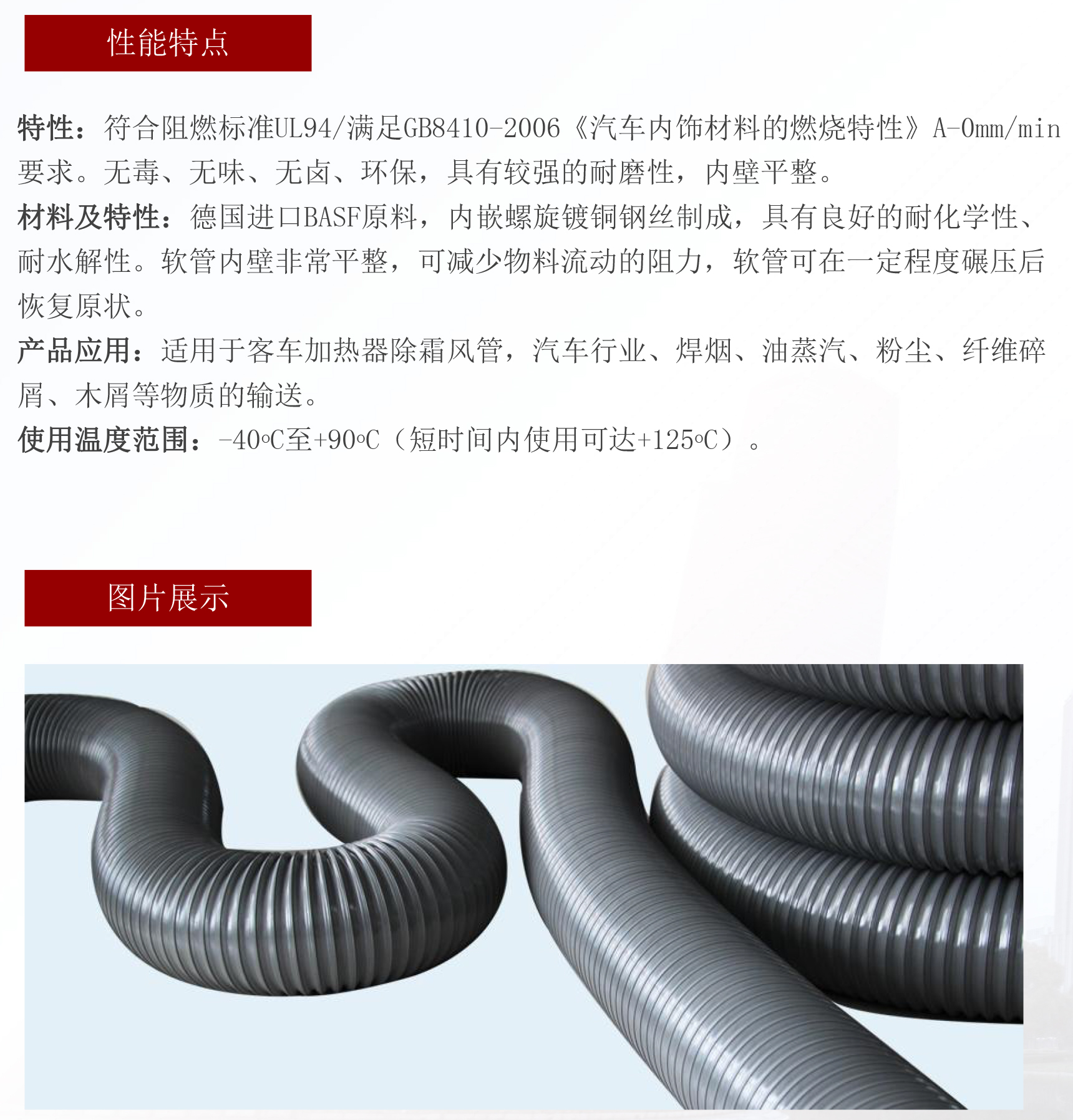 材料特性:采用德國BASF阻燃PU原料,內嵌阻燃塑料加強筋制成,具有耐化學性,耐水解性。軟管內壁非常平整,可減少物料流動的阻力,軟管可在一定程度碾壓后恢復原狀。產品應用:適用于冷風及暖風的輸送,汽車行業、焊煙、油蒸汽、粉塵、纖維碎屑、木屑等物質的輸送。
