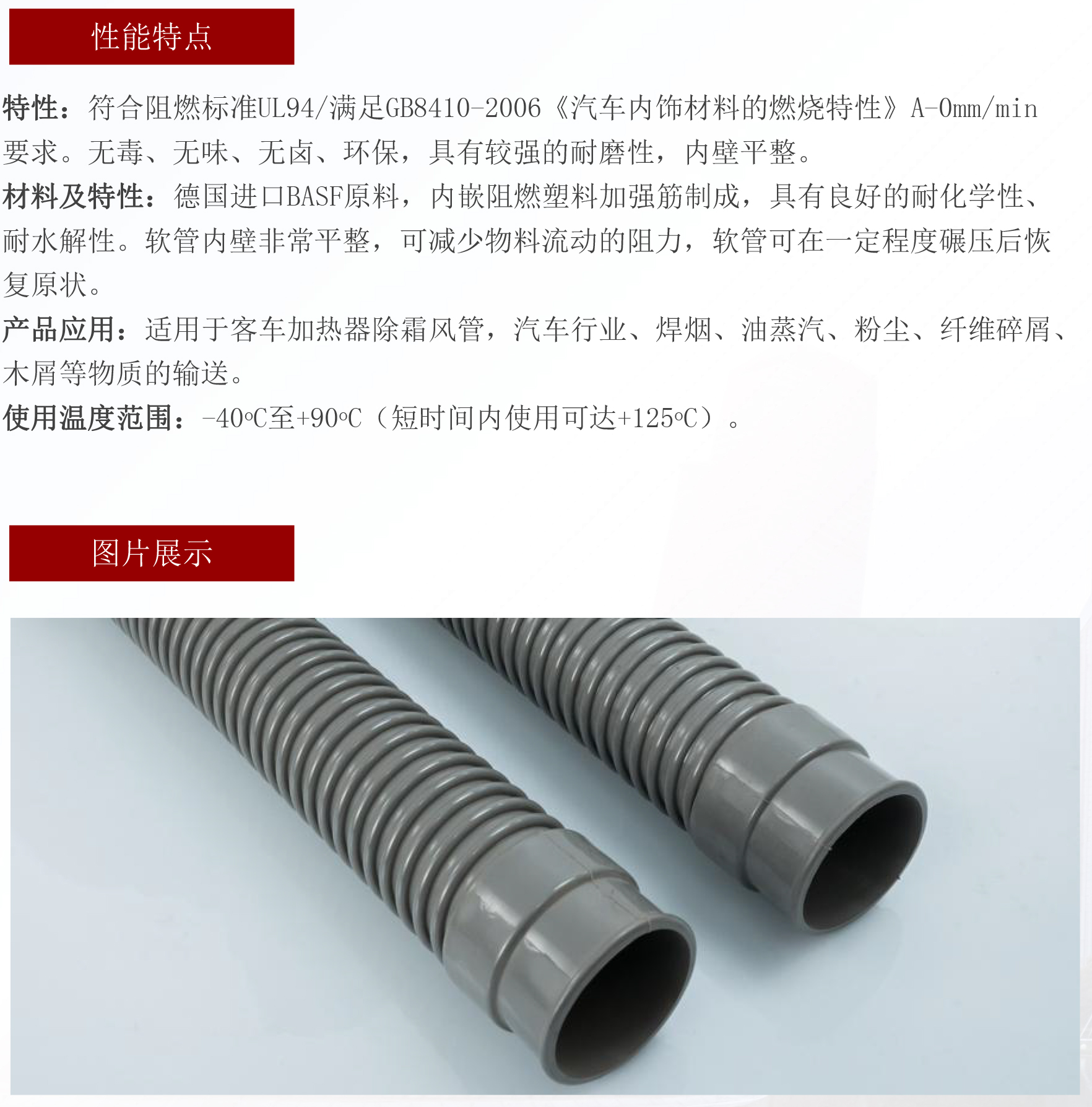 材料特性:采用德國BASF阻燃PU原料,內嵌阻燃塑料加強筋制成,具有耐化學性,耐水解性。軟管內壁非常平整,可減少物料流動的阻力,軟管可在一定程度碾壓后恢復原狀。產品應用:適用于冷風及暖風的輸送,汽車行業、焊煙、油蒸汽、粉塵、纖維碎屑、木屑等物質的輸送。