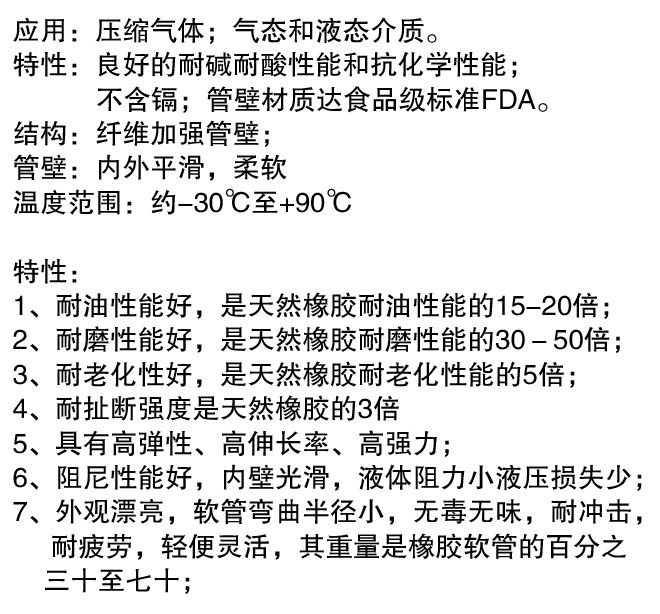 采用TPU材料生產的軟管具有抗拉伸、張力強、撕裂強度高、耐磨損、耐折曲、耐穿透、耐低溫、耐水解等性能,并具有很好的回彈性且使用壽命長。本品不含增塑劑,無毒無味,是一種高性能環保型軟管。是PVC、橡膠軟管的替代產品。