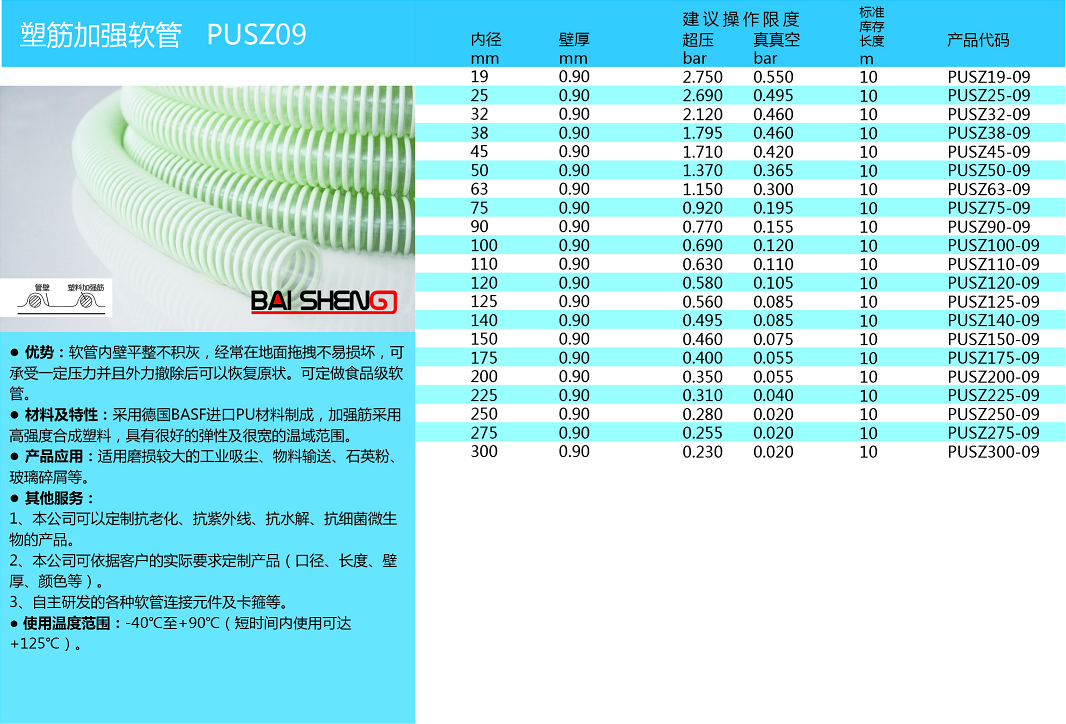 產品特點:適用于工礦、農業和水利、土木工程、食品、石油、化工、衛生等行業的真空抽吸粉末、顆粒,輸送水、油、化工材料、食品等,在農田灌溉、工礦、油庫、抽砂、噴砂、食品、醫藥及室內的氣體、粉末、灰塵吸收排放等領域有著廣泛的用途。該產品是PVC、橡膠、金屬管材的替代產品。
