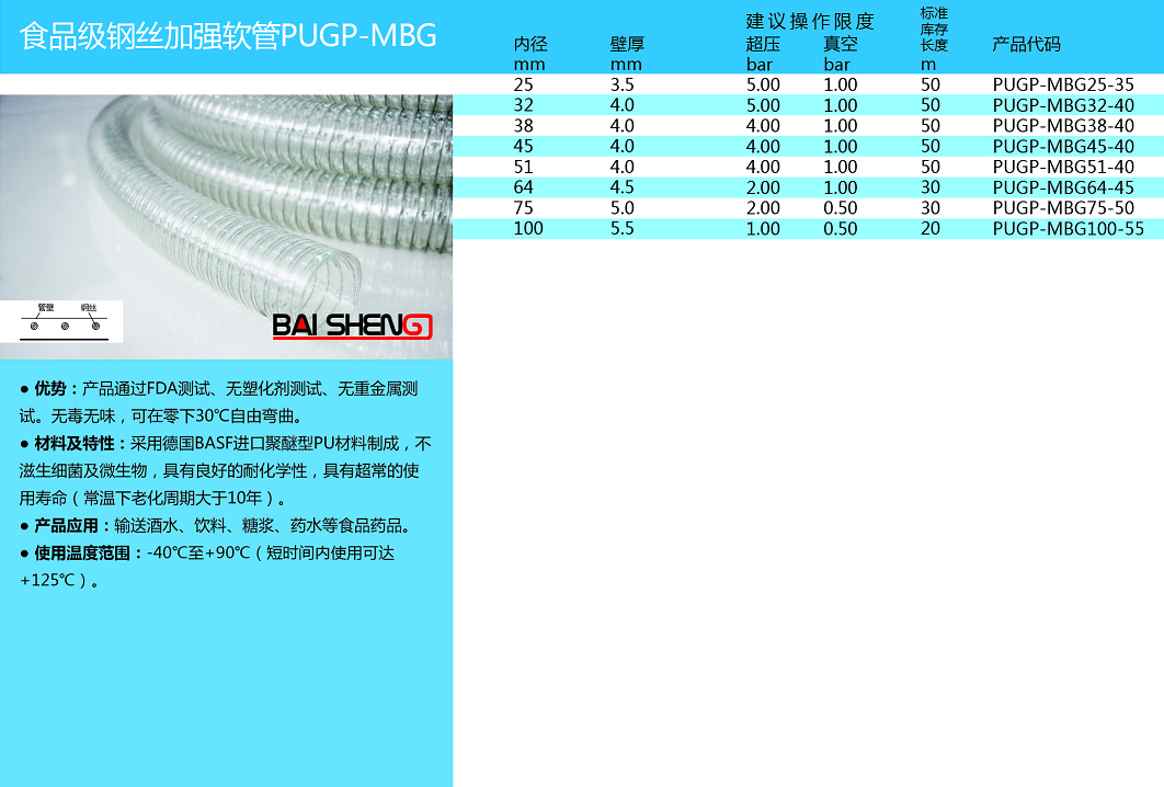 產品特點:本產品無毒無味,不含塑化劑,符合食品標準,可應用于食品、釀酒、飲料、醫藥、衛生等行業,是高壓、抽吸、輸送水、油、糖漿等液體的適用管材。
