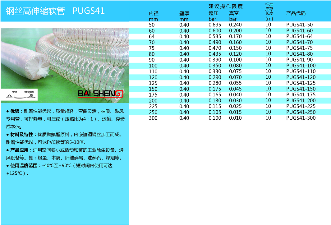 優 勢(shi):耐(nai)磨性能優越,質(zhi)量(liang)超輕(qing),彎曲(qu)靈(ling)活,抽吸、鼓風用管(guan),可排靜電(dian),可壓(ya)縮(suo)(壓(ya)縮(suo)比4:1)。運輸(shu)、存(cun)儲成(cheng)本低。